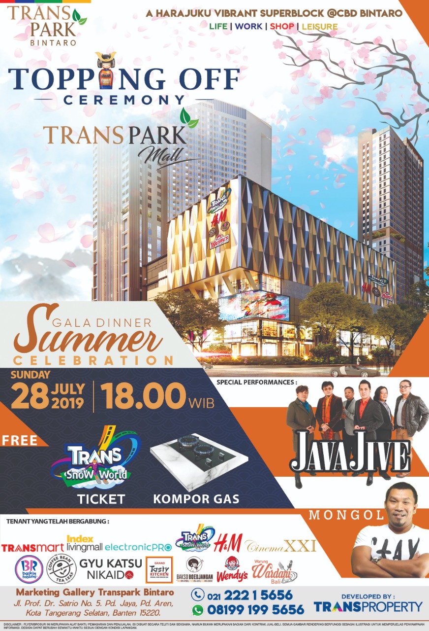 Topping Off Ceremony Transpark Mall * * * Gala Dinner Summer Celebration Day: Sunday, 28th July, 2019 Time: 06:00 PM - ONWARDS Special Performance: Java Jive, Mongol, Madam Arra. For Further Information Call Phone Office: (021) 222 1 5656 At Transpark Bintaro Marketing Gallery Jl. Prof. Dr. Satrio. No.5, Pd. Jaya Pd. Aren. Kota Tangerang Selatan. Banten 15220.
